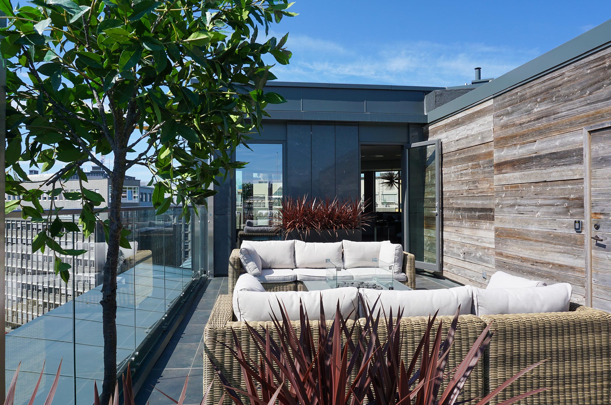 The second rooftop terrace connects to the living room upstairs. It has a charming city view of Oslo and allows you to experience the light summer evenings in comfy lounge sofas. If it gets a bit chilly, just light up the fire pit. This is also the perfect spot for sunbathing on a hot summer day. Large canvases can be arranged for full privacy.