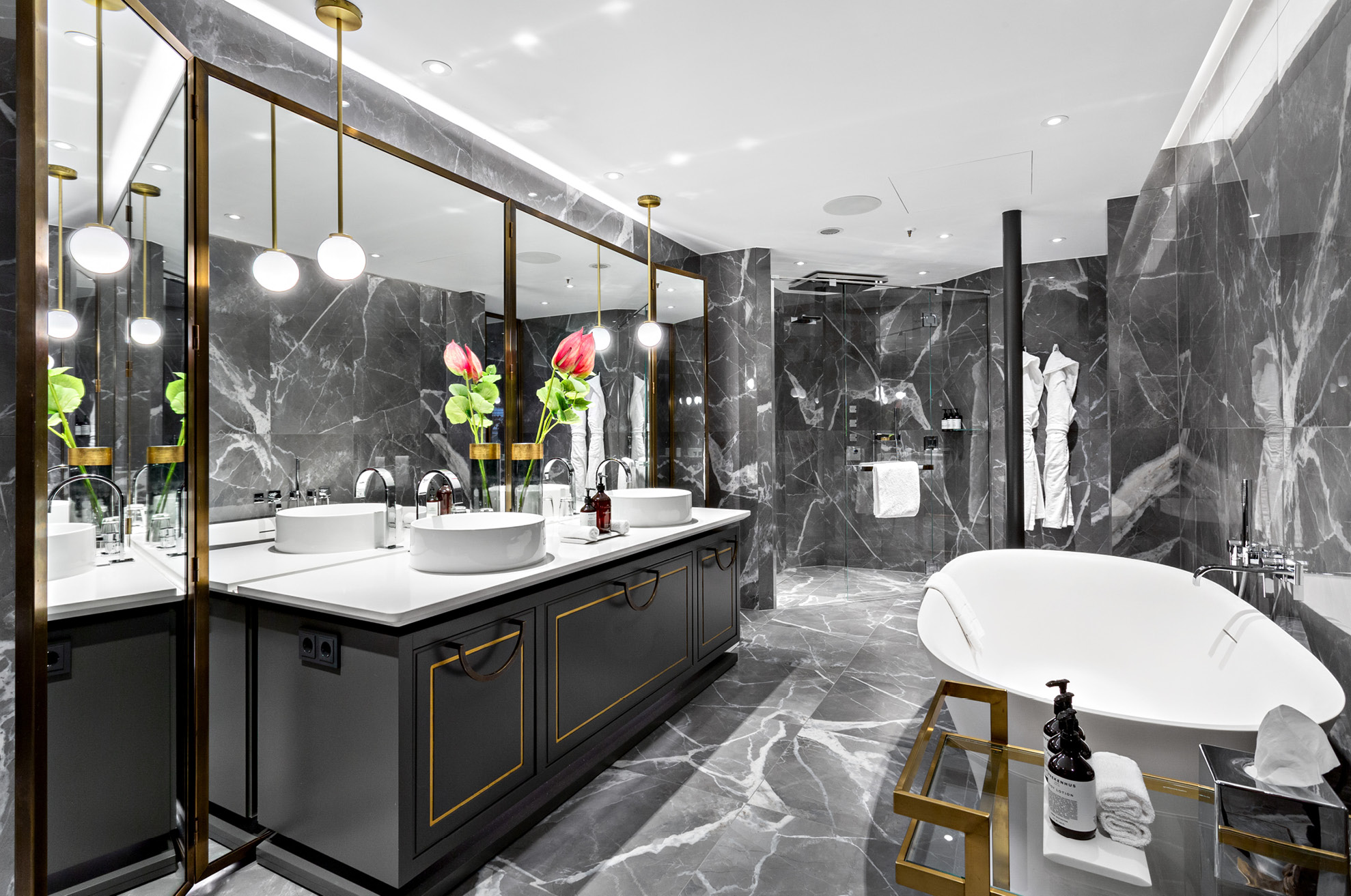 The spacious marble bathroom comprises a relaxing steam room with a starry sky ceiling, a large rainforest shower and a separate soaking tub. Exclusive SPREKENHUS bath amenities, bathrobes, slippers, and a hairdryer complete the refreshing experience during your stay.