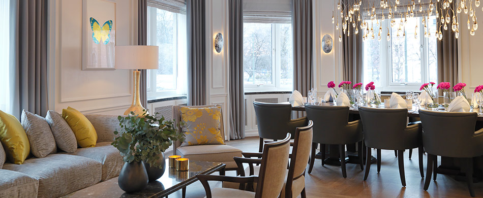With a view over the Palace Park, art by Damien Hirst, a unique chandelier and exclusive design, any gathering in Hjørnet becomes a highlight. This corner venue can accommodate up to 18 guests for lunch or dinner, and 16 for meetings.